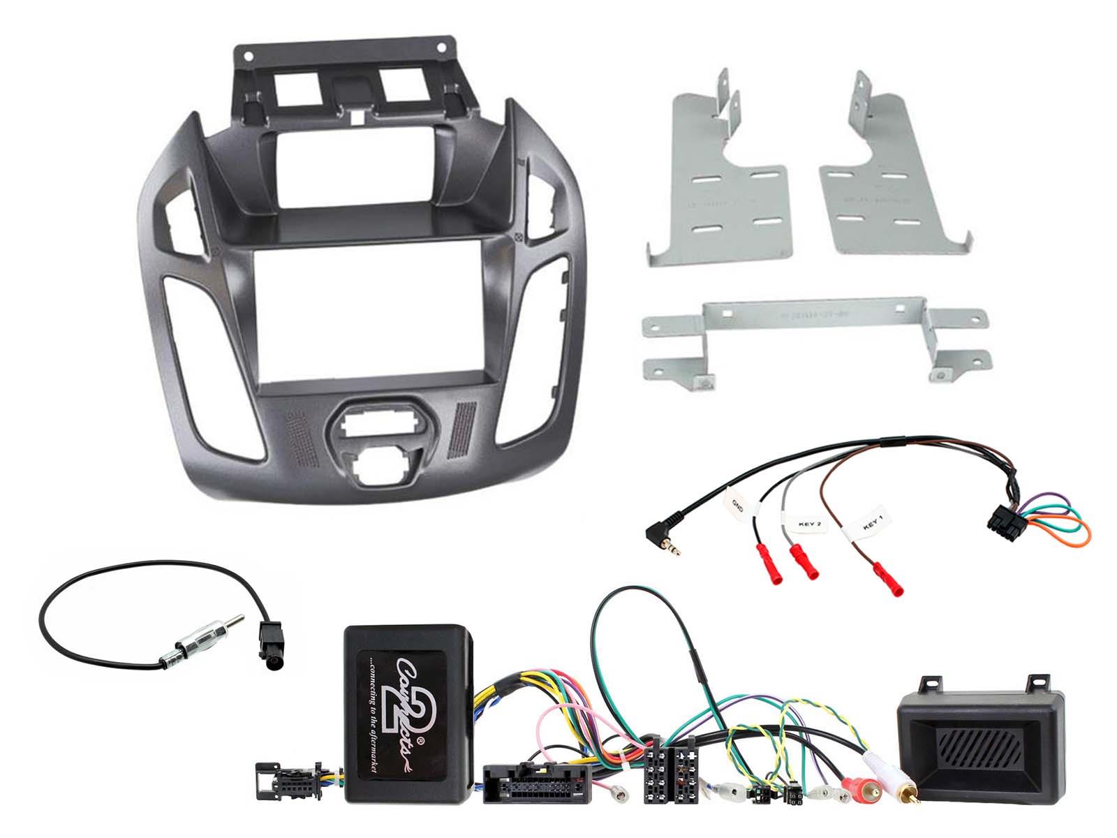 Complete installation kit including pegasus blue grey double DIN fascia panel, interface, antenna adapter and head unit patch lead.