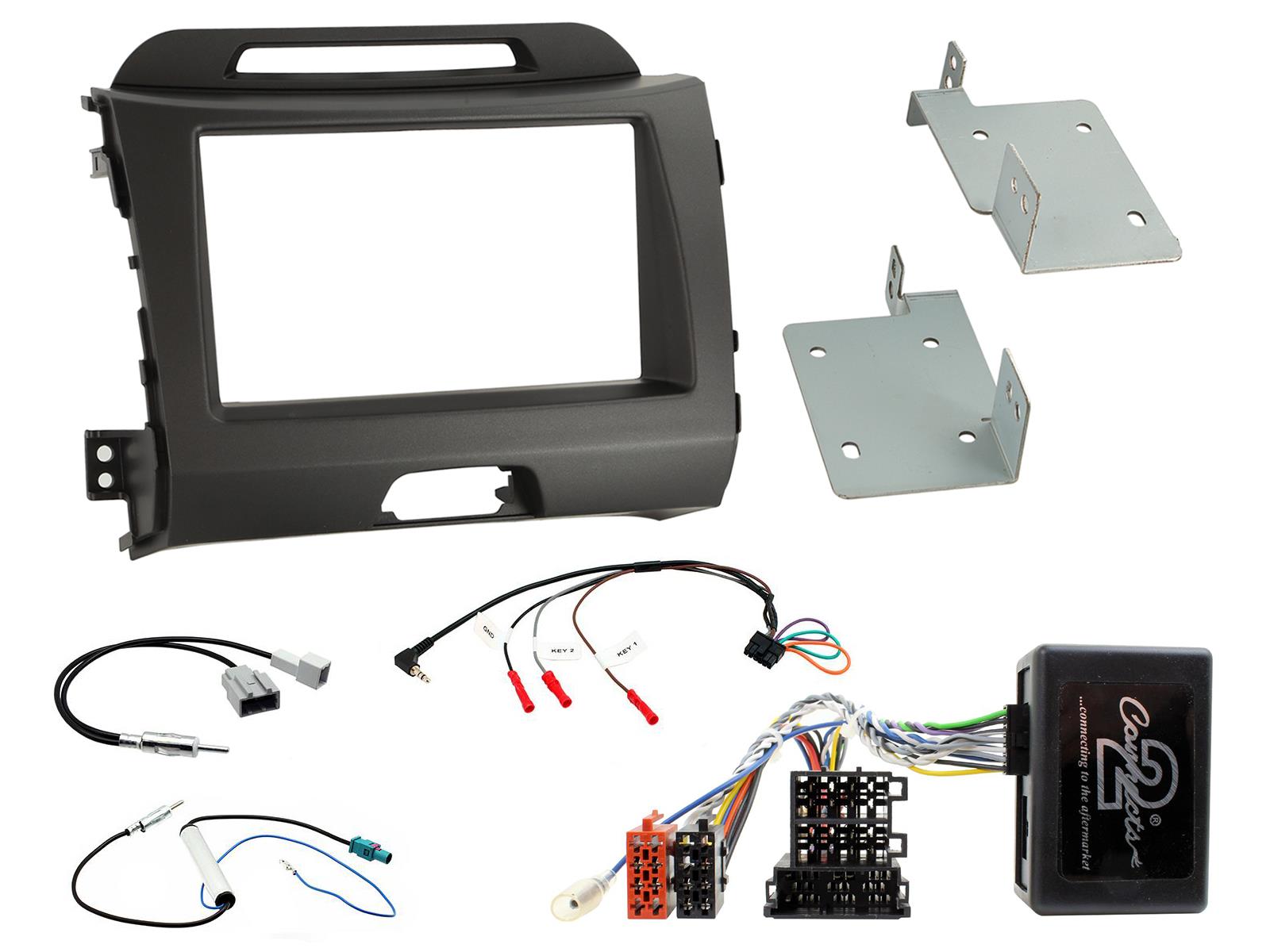 Kia Sportage Installation Kit. Supplied With Dark Grey Double DIN Fascia, Resistive Steering Wheel Control Interface, FAKRA And Kia Antenna Adapters & Universal Patchlead