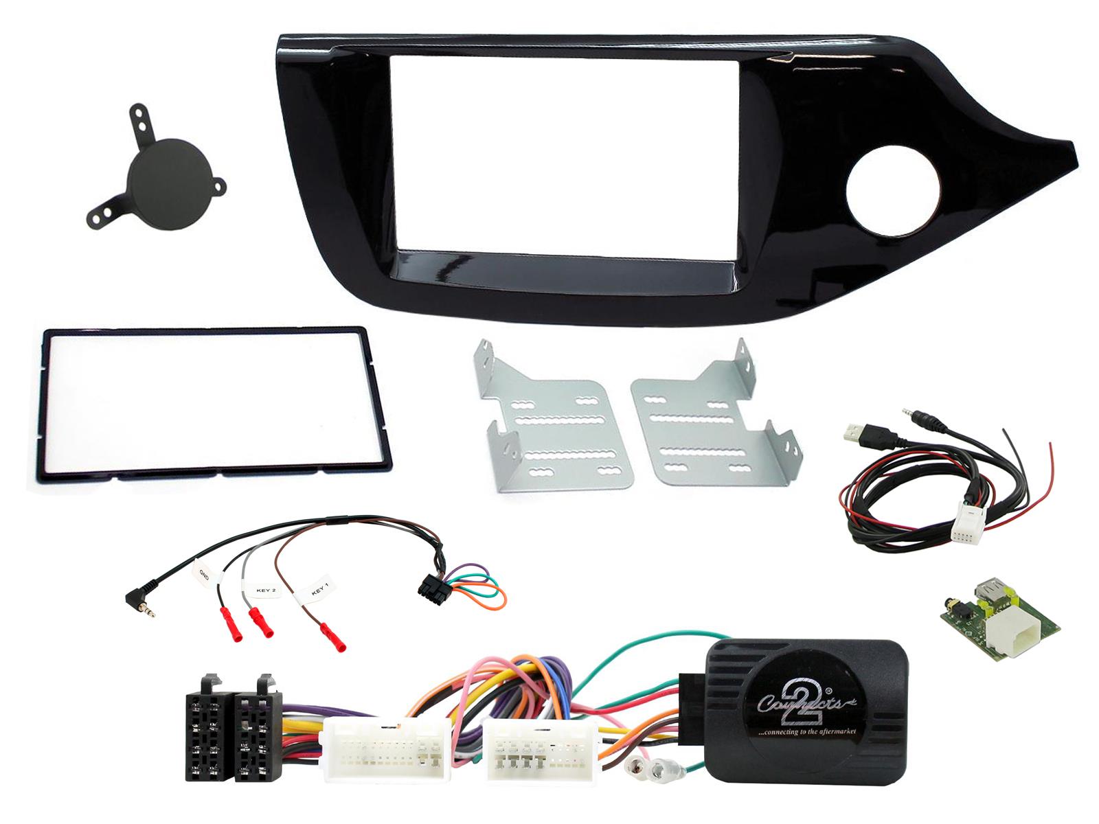 Kia Installation Kit. Supplied With Piano Black Double DIN Fascia, Steering Wheel Control Interface, USB/AUX Retention Interface & Universal Patchlead