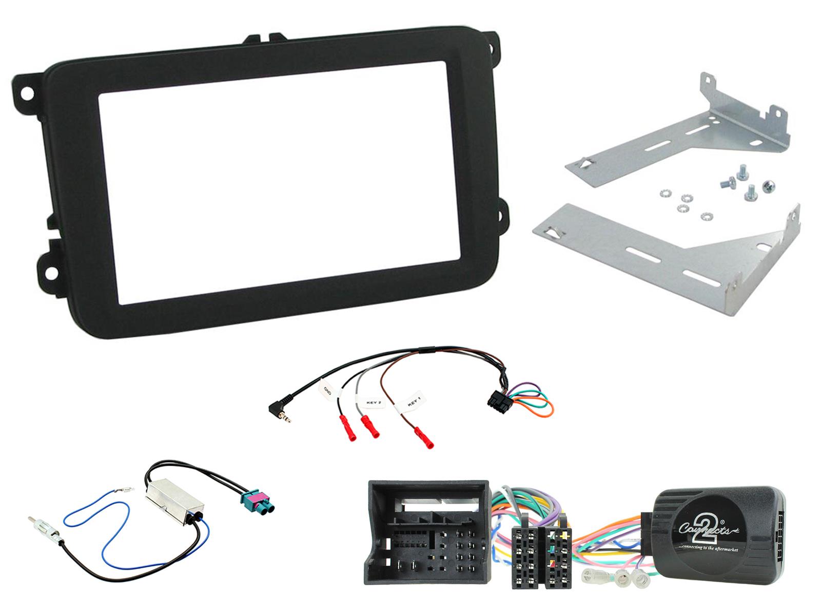 VW MIB-PQ Double Din Installation Kit. Supplied With Black Double DIN Fascia, Steering Wheel Control Interface, Twin FAKRA Antenna Adapter & Universal Patchlead